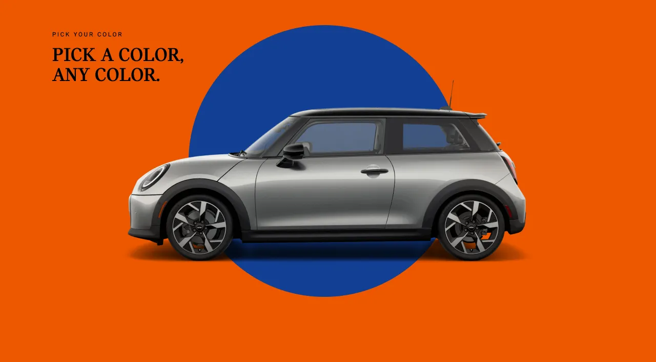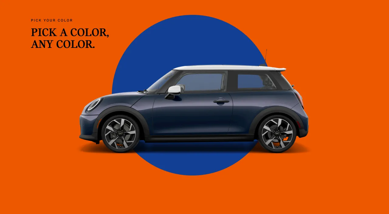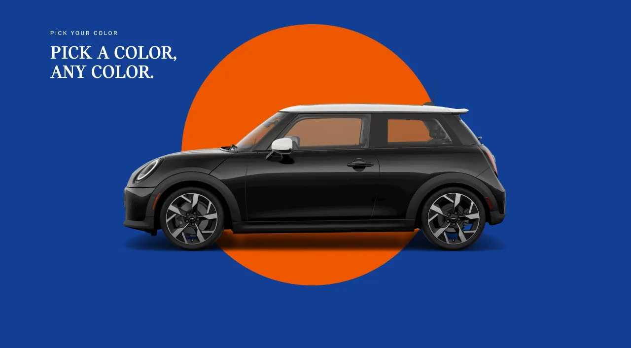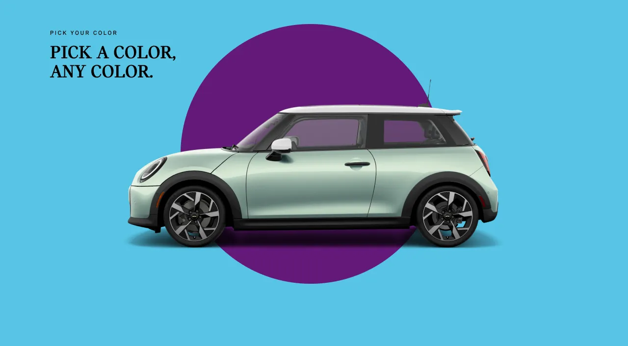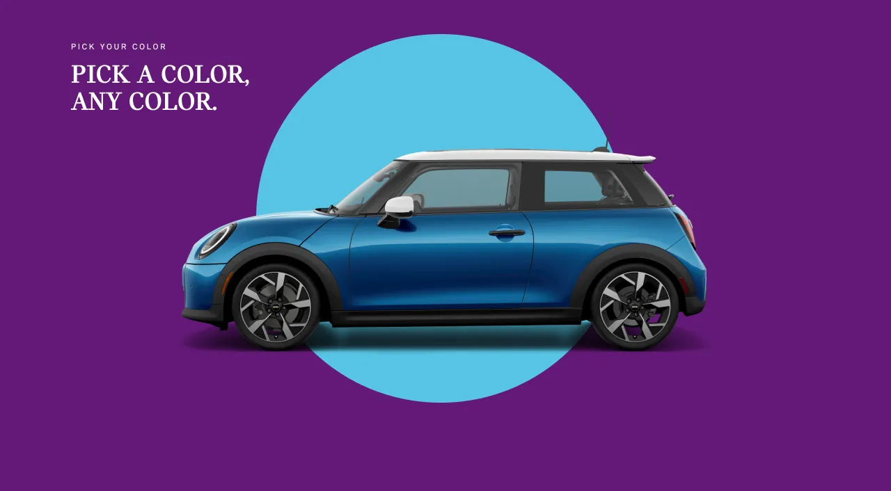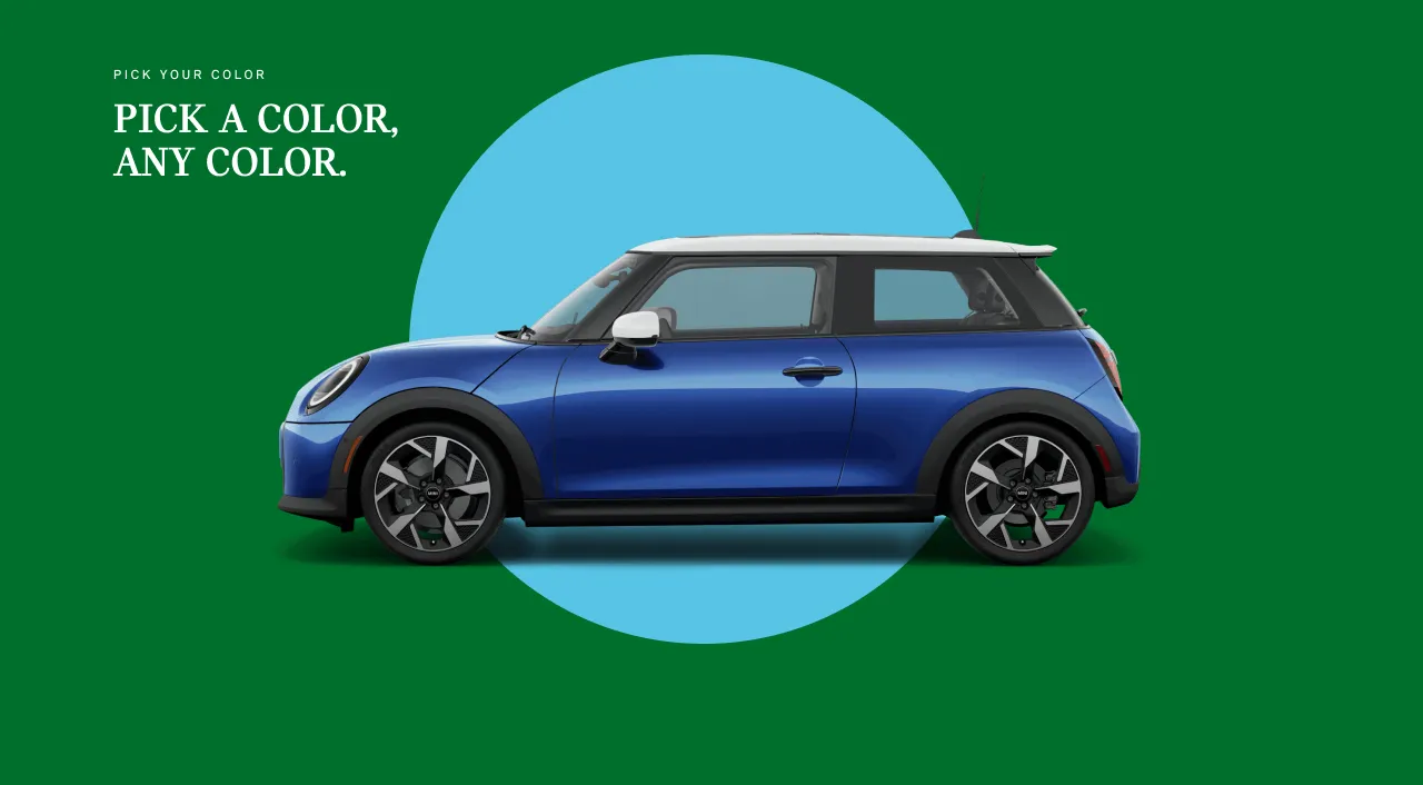 The MINI Cooper 2 Door is available in a range of exterior body colors including Melting Silver III, Midnight Black II, Nanuq White, British Racing Green IV, Chili Red, Blazing Blue, Ocean Wave Green, and Sunny Side Yellow.
