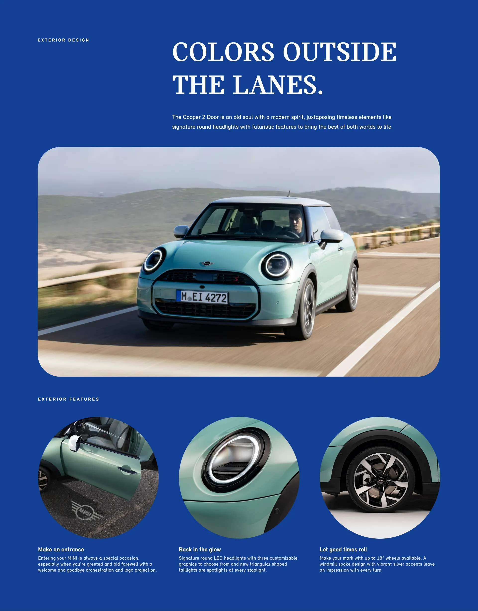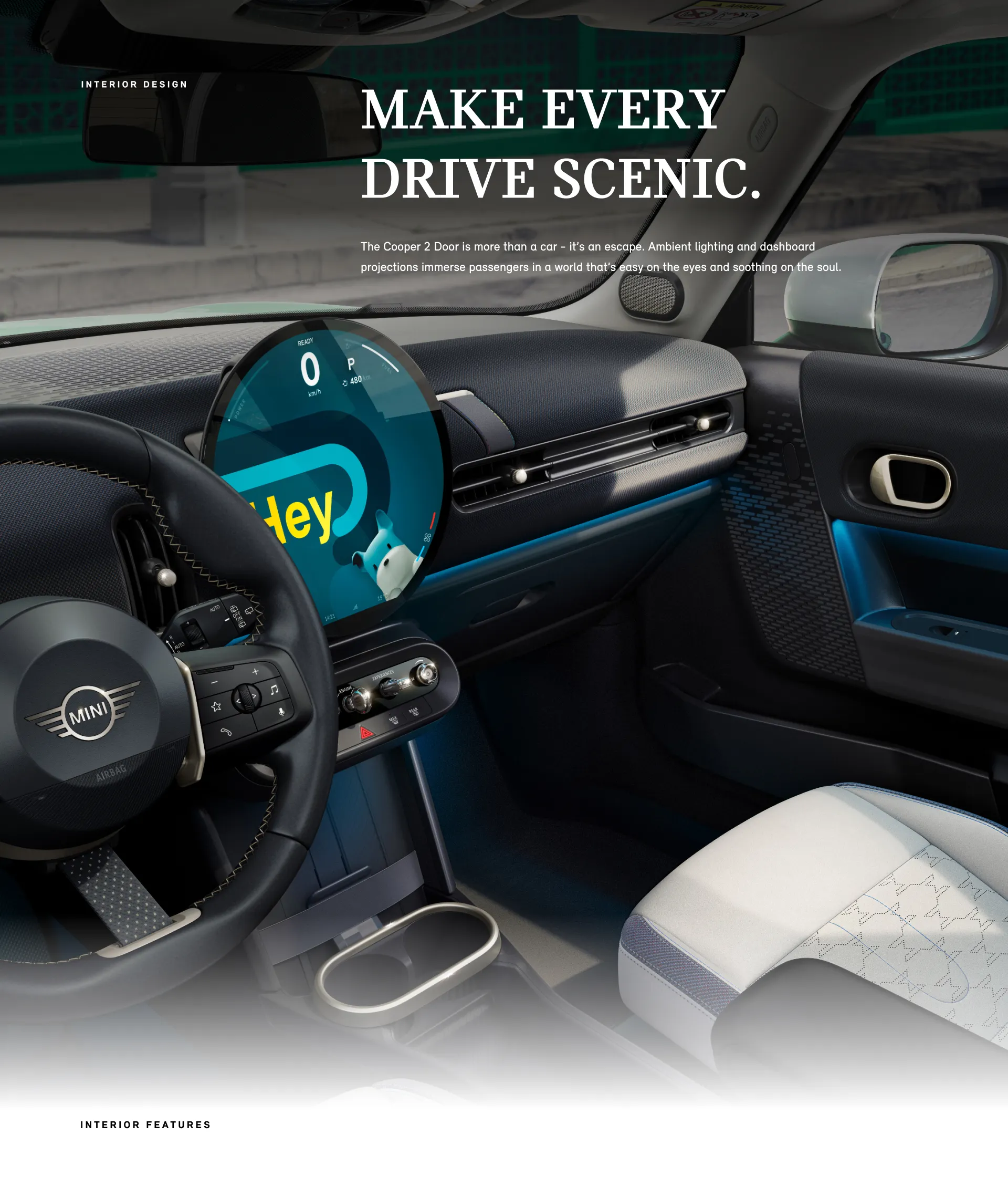New features on The MINI Cooper 2 Door include a 9.4” round OLED display with a refreshing user interface design, MINI Operating System 9 optimized for touch control and developed in-house by the BMW Group, MINI’s Intelligent Personal Assistant, and eight MINI Experience Modes which use light projections to set the stage for an immersive driving experience.