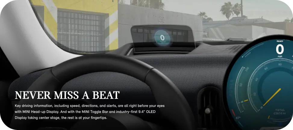 With the industry-first, circular 9.4” OLED display and the MINI Toggle Bar taking center stage, everything you need, from volume control to the MINI Experience Modes, is right at your fingertips.