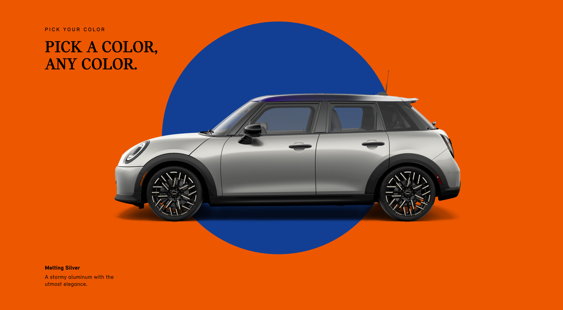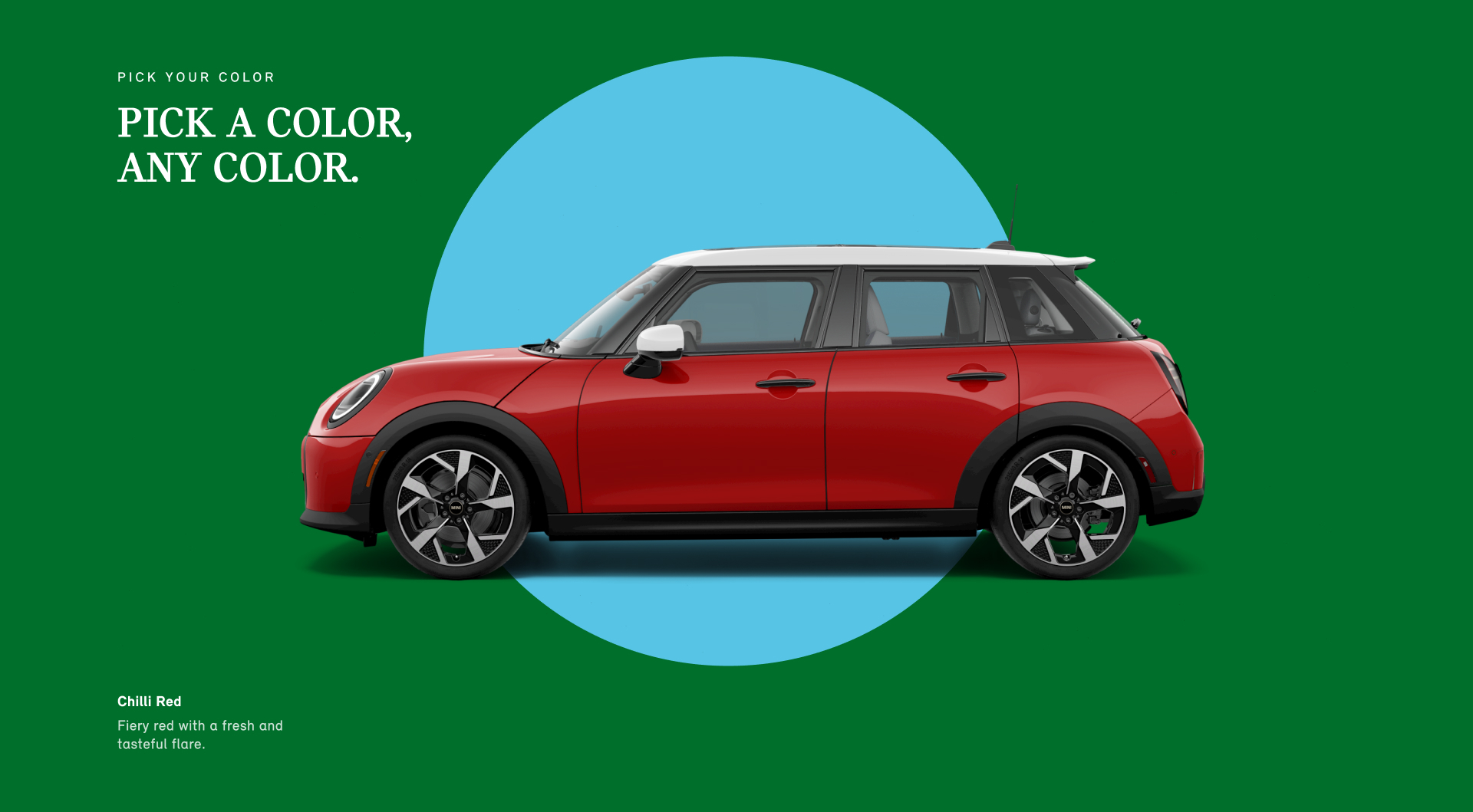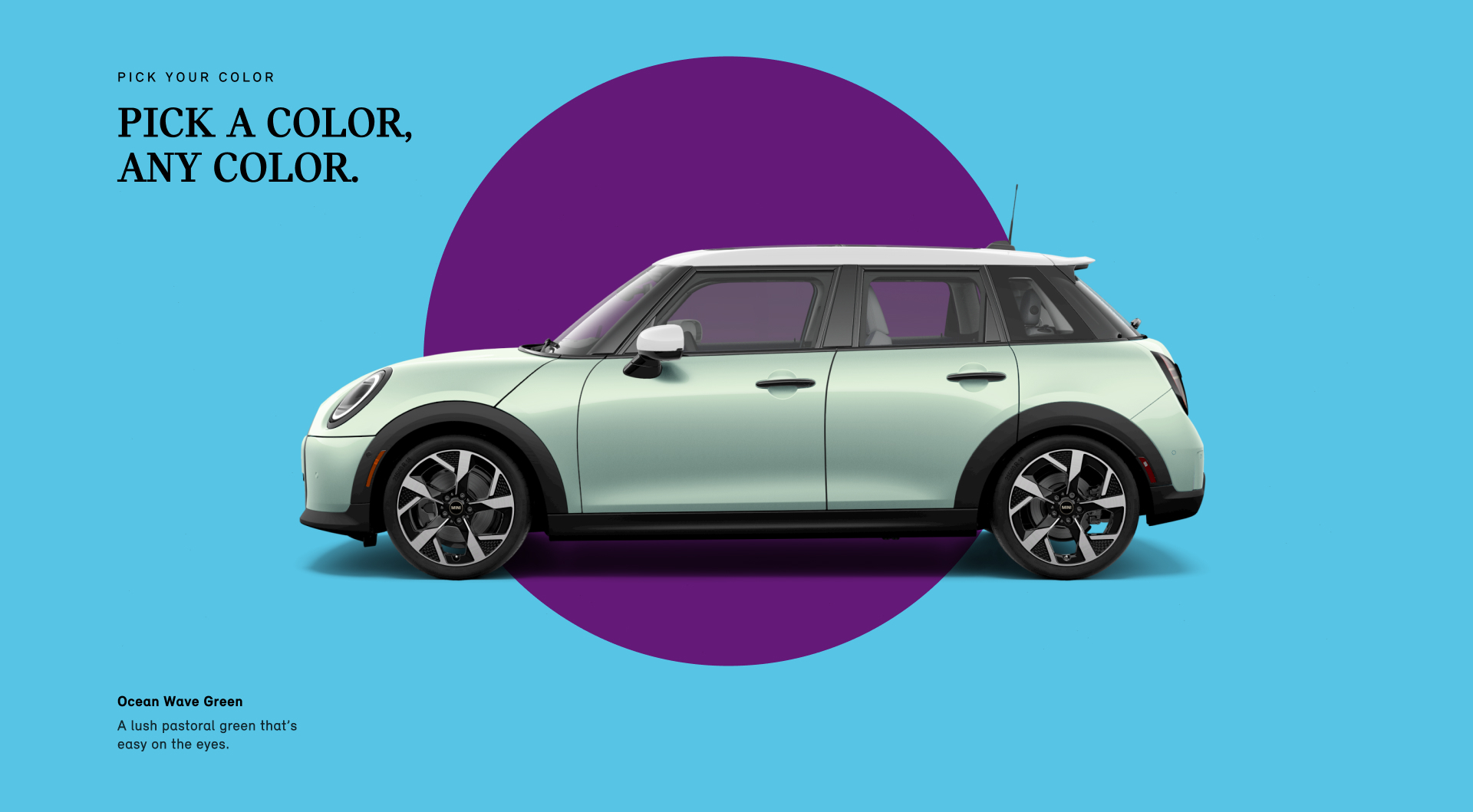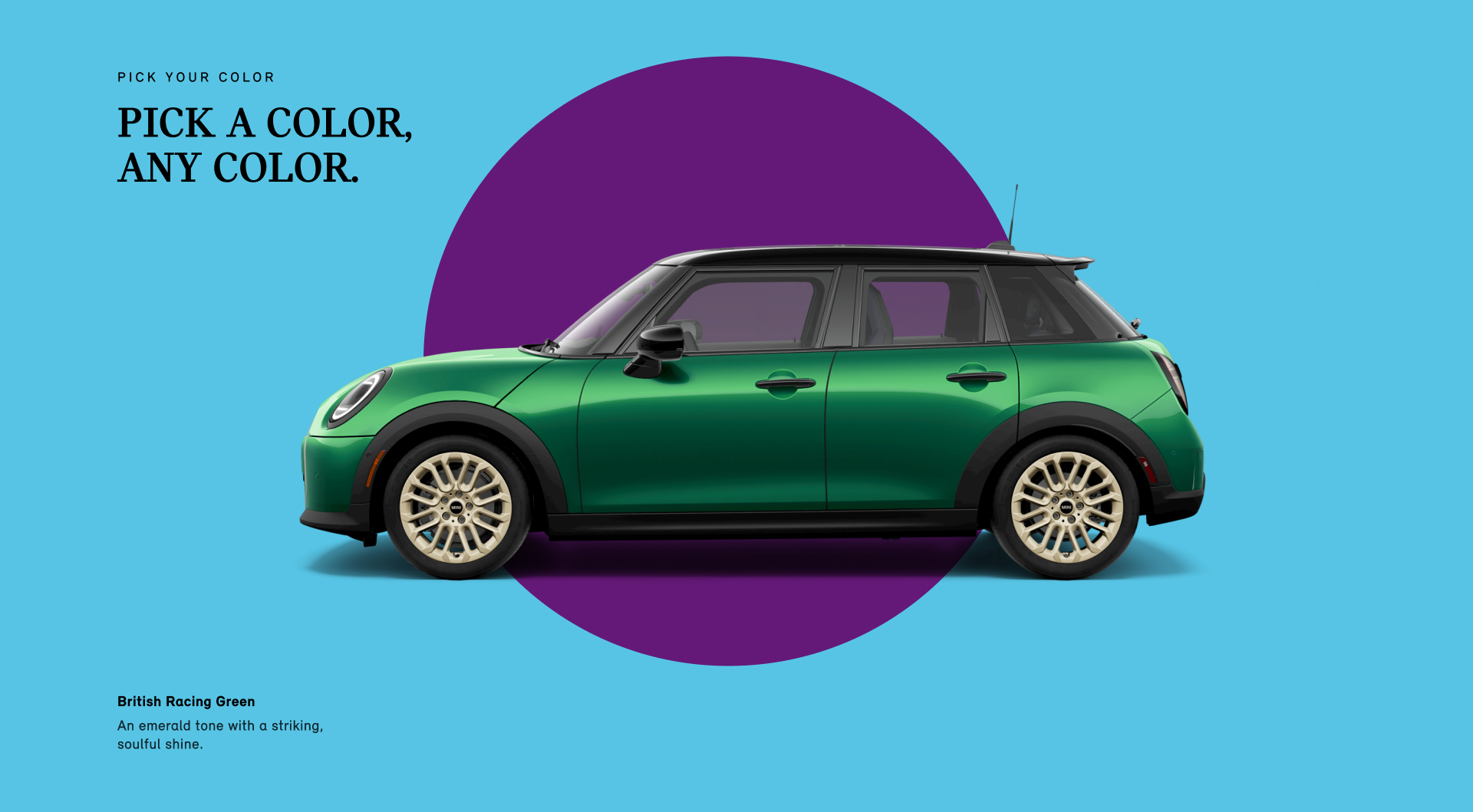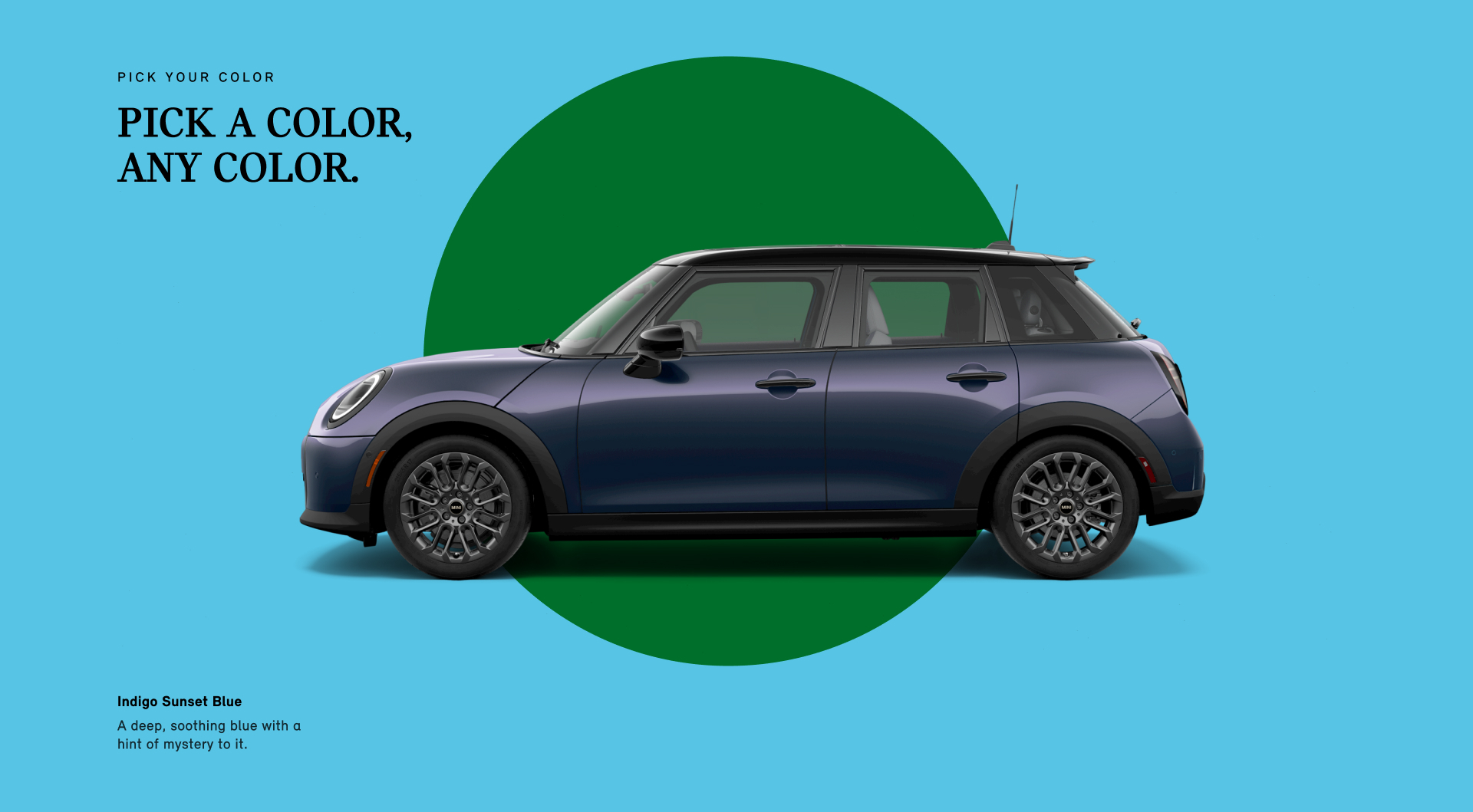 The MINI Cooper 4 Door models are available in Sunny Side Yellow, Chili Red II, British Racing Green IV metallic, Midnight Black II, Nanuq White metallic, Melting Silver III metallic, Indigo Sunset Blue, Blazing Blue, Icy Sunshine Blue, and Ocean Wave Green.