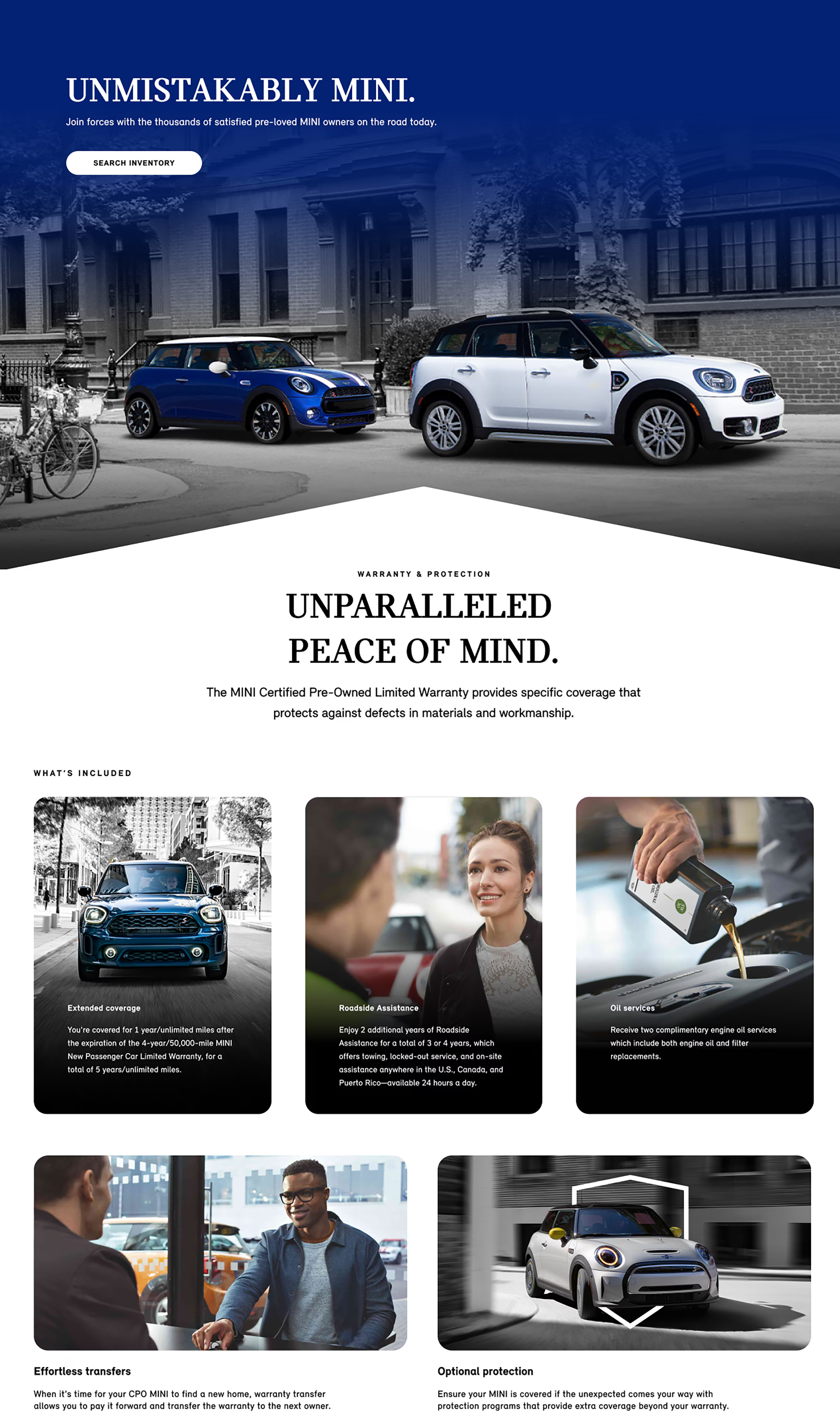 The MINI Certified Pre-Owned Limited Warranty covers defects in materials and workmanship for up to 6 years/unlimited miles.